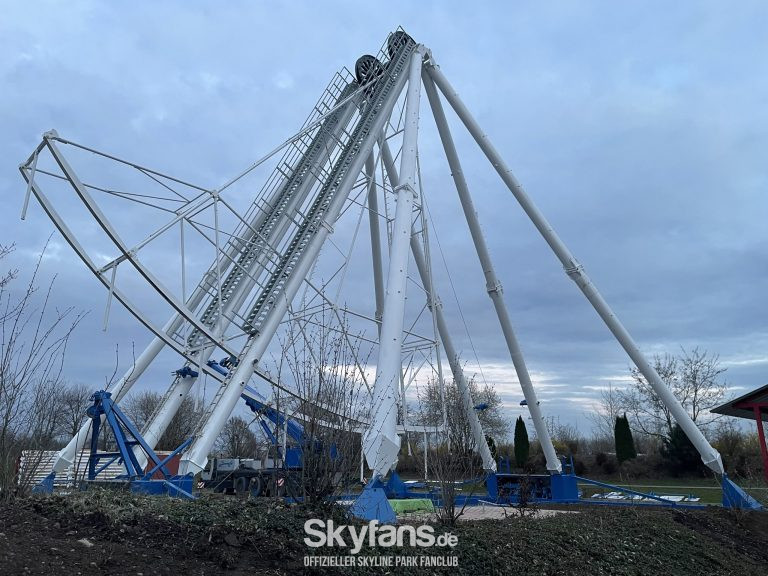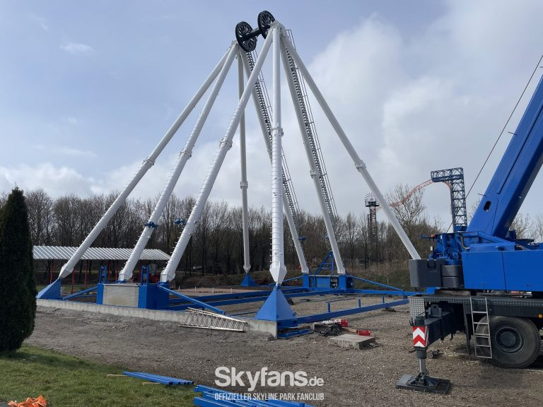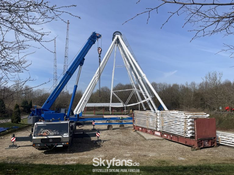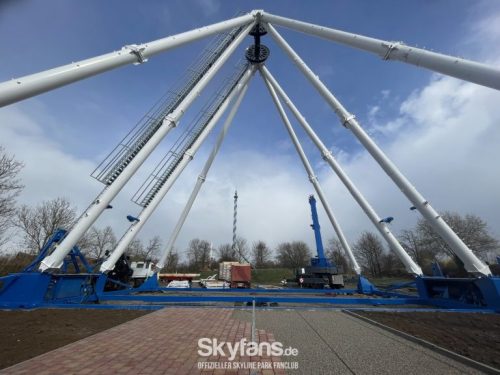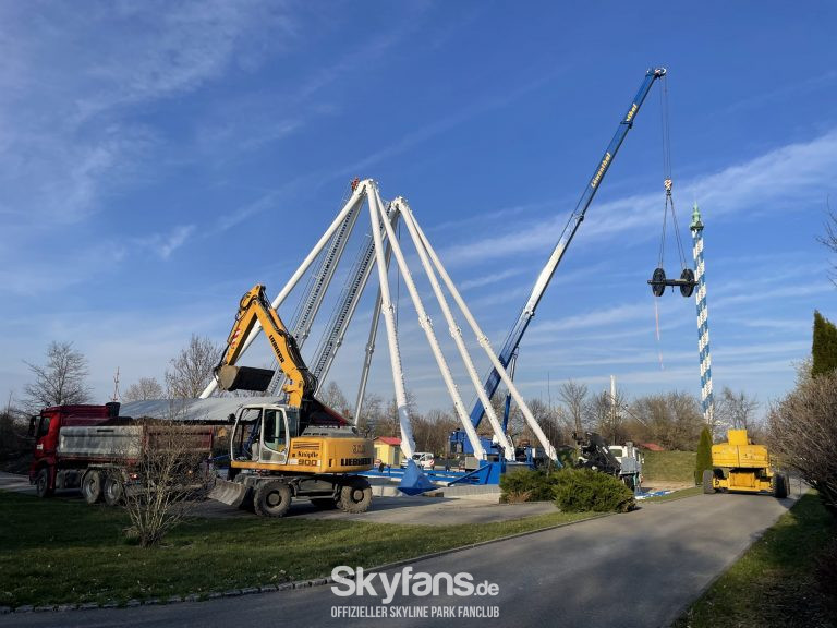 - das frisch renovierte Riesenrad wächst Stück für Stück. Nachdem die Stützen mitsamt der Nabe standen, konnte die Montage der ersten Speichen und des Außenrings starten. Rund um das Fahrgeschäft fanden Erdarbeiten und Pflasterarbeiten für den Zugang statt
